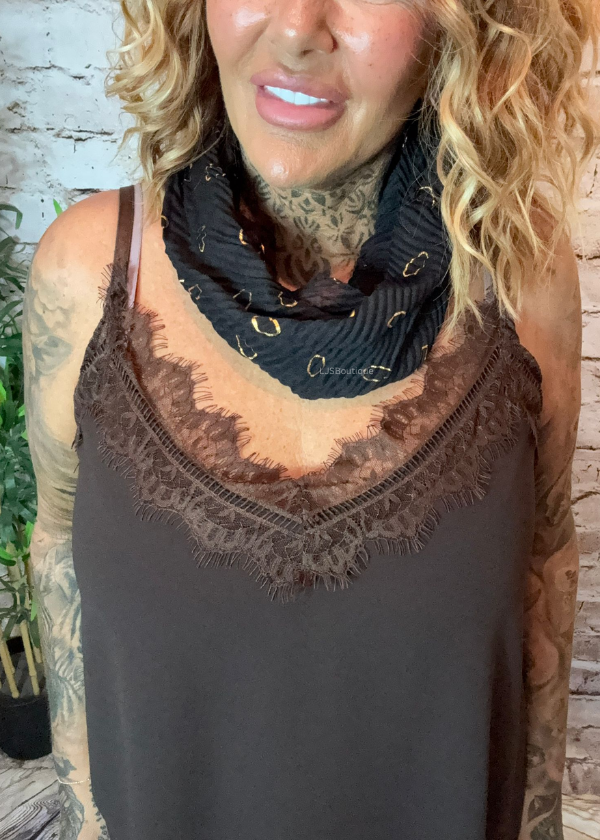 A soft polyester Gold hoops print snood with a crinkle cut finish. The crinkle effect gives the scarf more body.
