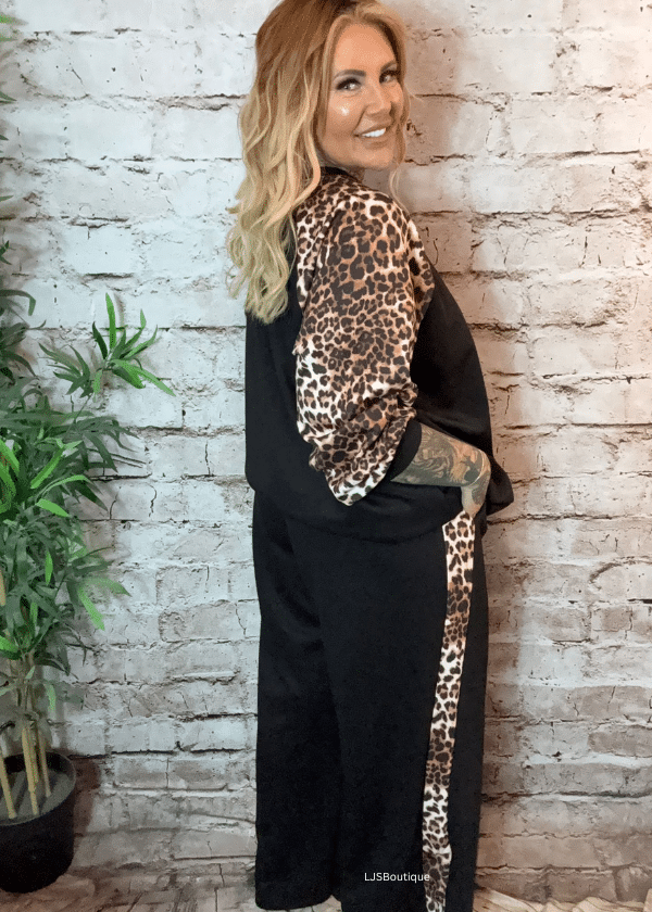 The matching trousers are finished with coordinating animal print side stripes for a complete, put-together look.