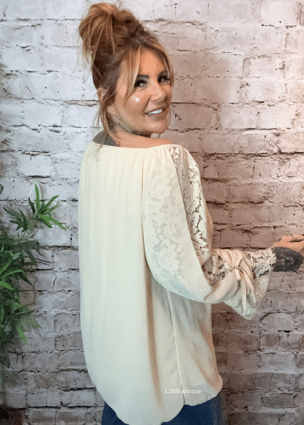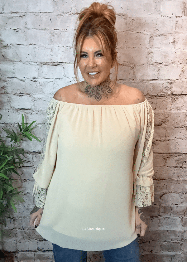 Designed with a flattering Bardot neckline, delicate frilled cuffs, and eye-catching lace detailing, this blouse beautifully blends comfort with sophistication.