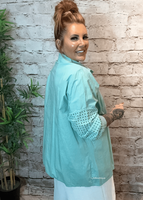A timeless cotton button-down shirt featuring an elegant open collar and delicate three-quarter broderie sleeves.