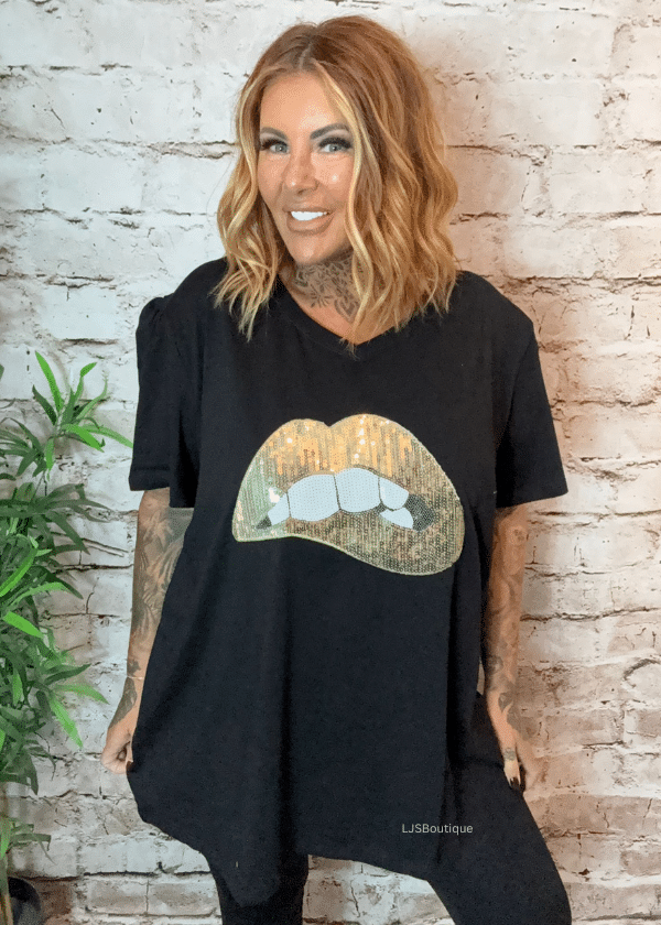 A fun and casual t-shirt with a sequin lip motif to the front and plain sleeves and a plain back.