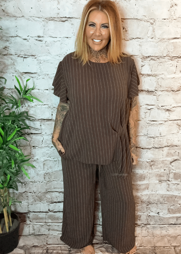 Crafted in a lightweight, breathable fabric and adorned with a striking pinstripe print, this set is designed for comfort and style in equal measure.