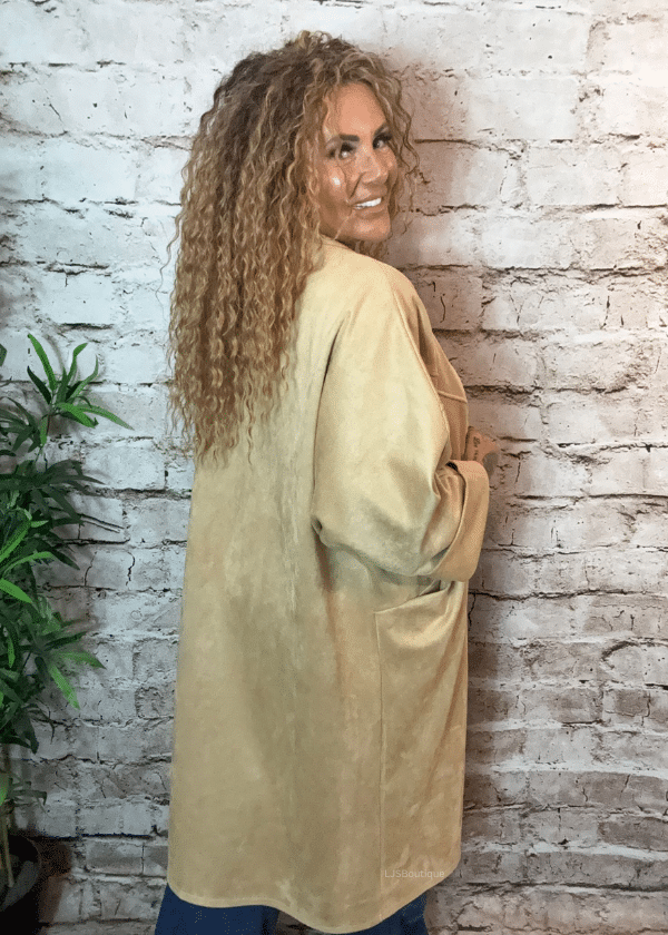 The London Faux Suede open front jacket is a must-have piece for the season.