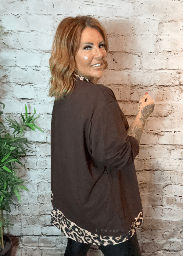 Make a statement with the May top, with eye-catching animal print hem, and button up grandad style collar.