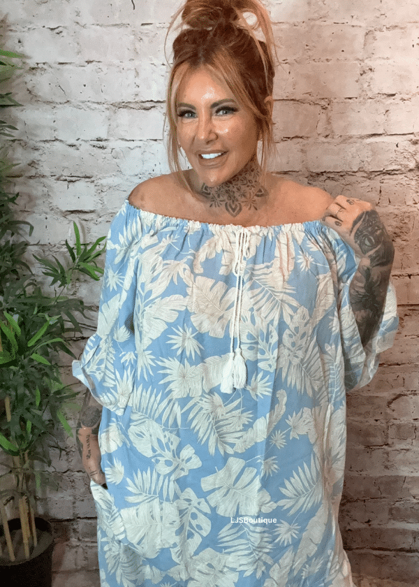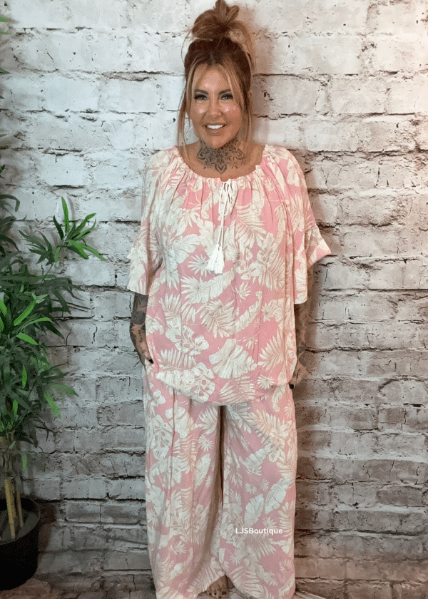 Crafted from a lightweight, breathable fabric, it features a flattering Bardot top with elegant frilled sleeves, paired with matching elasticated bottoms complete with practical pockets.
