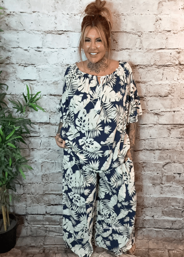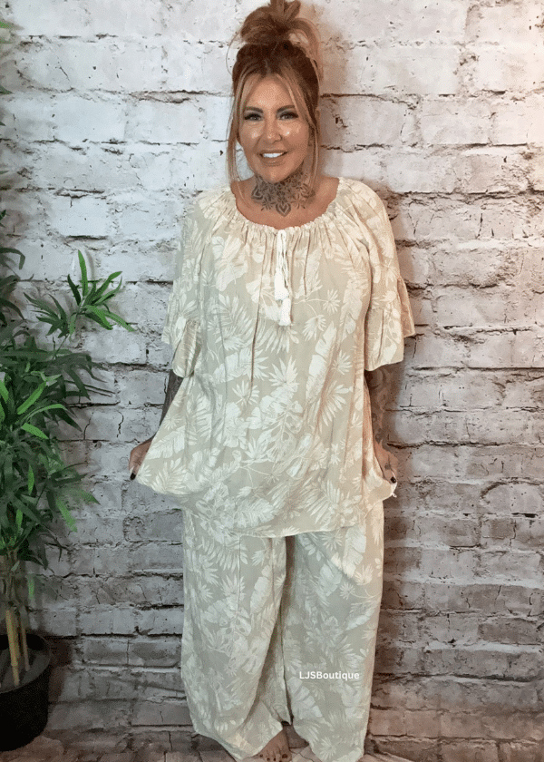 Finished with an eye-catching leaf print, this versatile outfit is an easy choice for any occasion—from relaxed days to dressed-up moments.