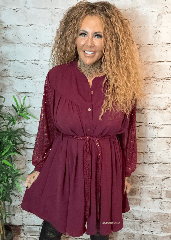 Turn heads at your next event with the stunning Seduced Blouse. Featuring a Grandad collar and beautifully embellished sequin belt and sleeves,