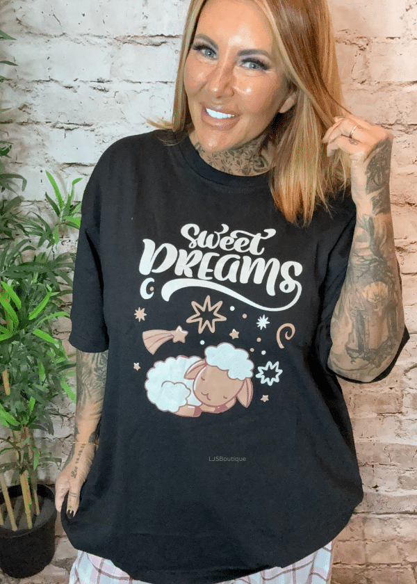 includes a t-shirt style long sleeve top and check printed full-length pyjama bottoms.